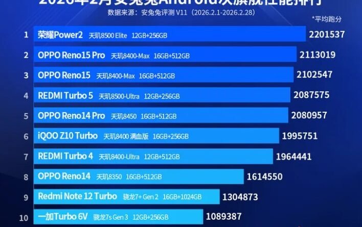 أما في المركزين الثاني والثالث، فقد جاءت هواتف شركة أوبو من طرازي Reno 15 و Reno 15 Pro، وكلاهما يعمل بمعالج Dimensity 8400 Max. وفي المقابل، تراجع هاتف ريدمي Turbo 5 التابع لشركة شاومي ليحتل المركز الرابع رغم تزويده بمعالج Dimensity 8500 Ultra، حيث كان من المتوقع أن يقدم أداء أفضل يتناسب مع قوة المعالج .