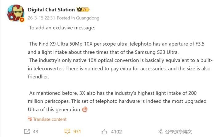 وتظهر قوة هذه العدسة الجديدة التي تحمل علامة Hasselblad التجارية بوضوح عند مقارنتها بإصدارات المنافسين السابقة. وتتفوق هذه الكاميرا بشكل ملحوظ على عدسة التقريب بمعدل 10x التي استخدمتها شركة سامسونج في هاتف Galaxy S23 Ultra والتي اعتمدت على مستشعر أصغر يبلغ 1/3.52 بوصة وفتحة عدسة أضيق تبلغ f/4.9، لتقدم أوبو بذلك كاميرا أسرع وأكثر كفاءة بمقدار 3.24 مرة مقارنة بجهود سامسونج السابقة في هذا المجال الدقيق لتصوير العناصر البعيدة.